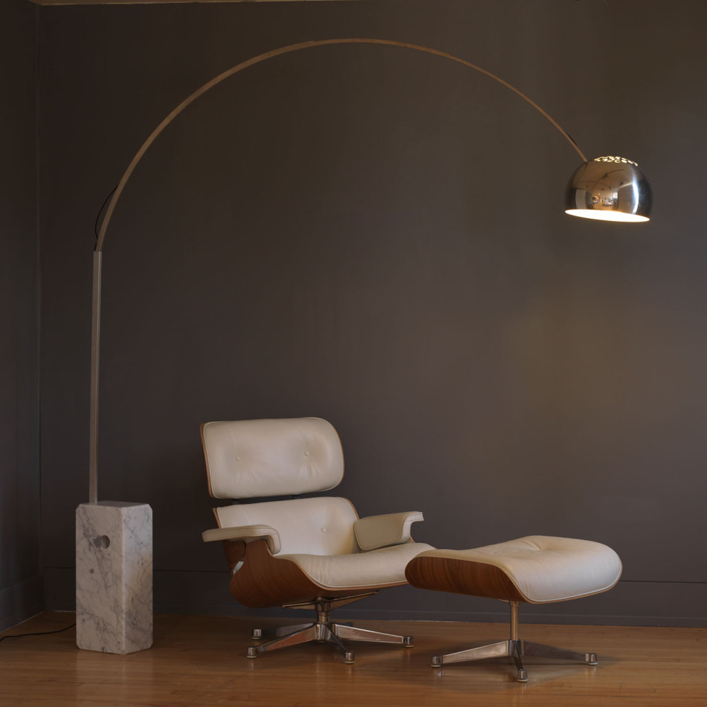 Base in marmo bianco di Carrara, stelo telescopico in acciaio inossidabile satinato; riflettore orientabile e regolabile in altezza in alluminio stampato, lucidato e zapponato.