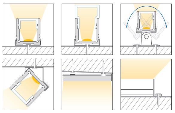 Accessori: clip di fissaggio a vista, tappi finali e giunto lineare