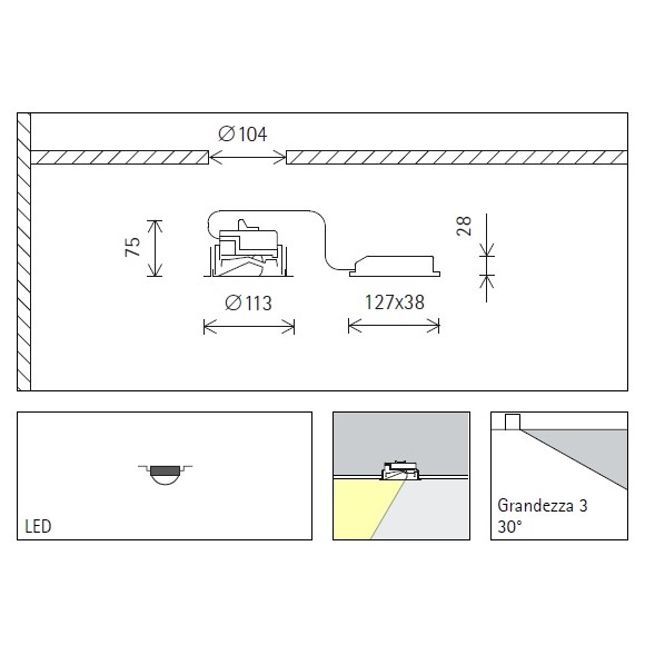 Alimentatore incluso, disponibile con accensione on/off oppure dimmerabile DALI.