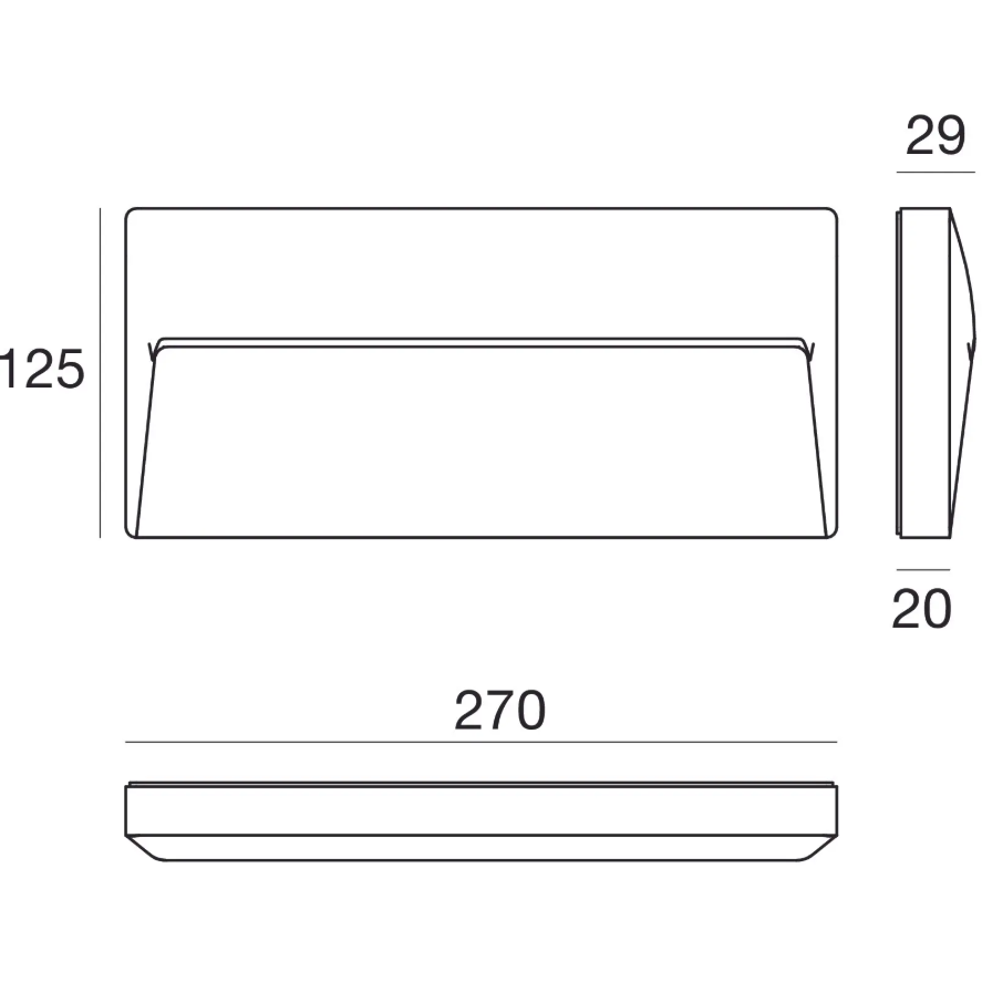 Lampada a parete con installazione in superficie o controcassa IP65, CRI 80, ottica asimmetrica 121.2°, alimentatore on/off incluso, IK10 , finitura colore bianco, nero, grigio marrone, dim. 270 x 125 x 29mm