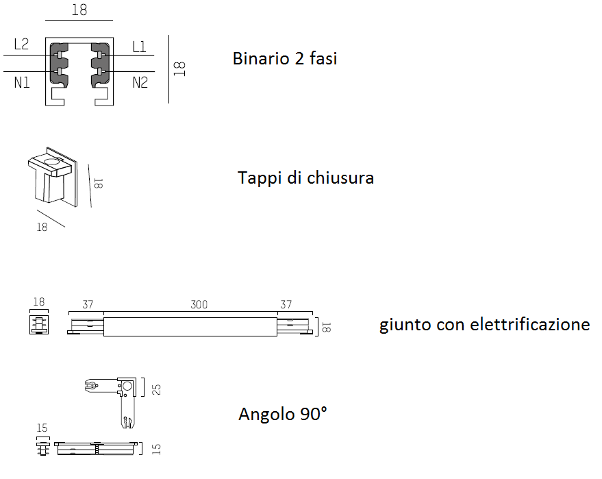 Binario 2 fasi componibile, disponibile nelle finitura bianco - cromo - nero - alluminio.